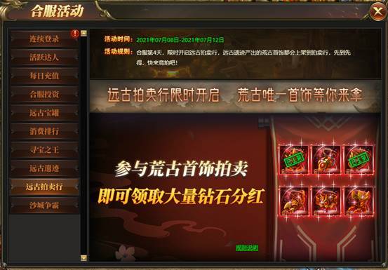 合服第4天,限时开启远古拍卖行,远古遗迹产出的荒古首饰都会上架到拍卖行,先到先得,快来竞拍吧!