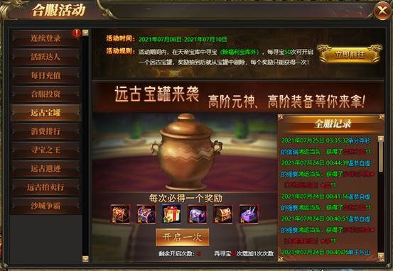 活动期间内,在天帝宝库中寻宝(除福利宝库外),每寻宝50次可开启一个远古宝罐,奖励抽到后就从宝罐中剔除,每个奖励只能获得一次!