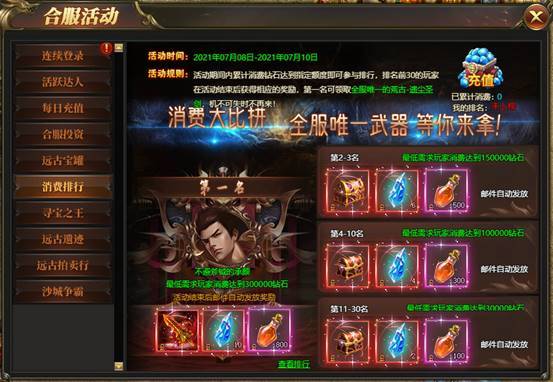 活动期间内累计消费钻石达到指定额度即可参与排行,排名前30的玩家在活动结束后获得相应的奖励,第一名可领取全服唯一的荒古-遗尘圣剑,机不可失时不再来!