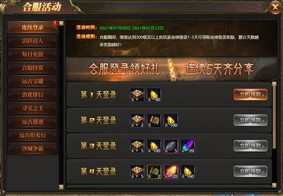 合服期间,等级达到300级及以上的玩家连续登录1-5天可领取连续登录奖励,累计天数越多奖励越好!