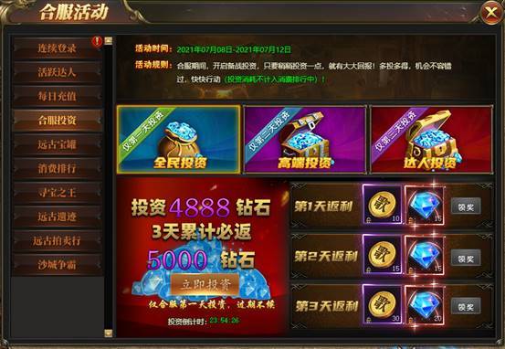 合服期间,开启备战投资,只要稍稍投资一点,就有大大回报!多投多得,机会不容错过,快快行动(投资消耗不计入消费排行中)!