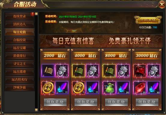 合服期间,每日充值达到指定金额即可免费领取豪礼!