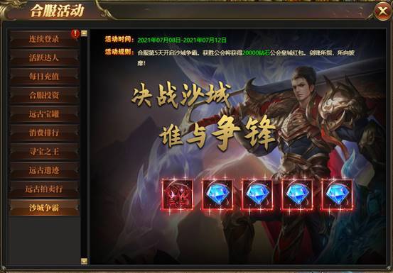 合服第5天开启沙城争霸。获胜公会将获得20000钻石公会皇城红包。剑锋所指,所向披靡!