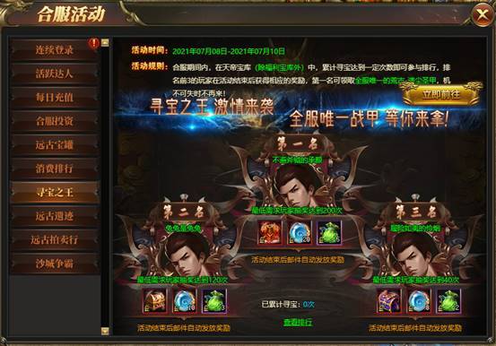 合服期间内,在天帝宝库(除福利宝库外)中,累计寻宝达到一定次数即可参与排行,排名前3的玩家在活动结束后获得相应的奖励,第一名可领取全服唯一的荒古-遗尘圣甲,机不可失时不再来!