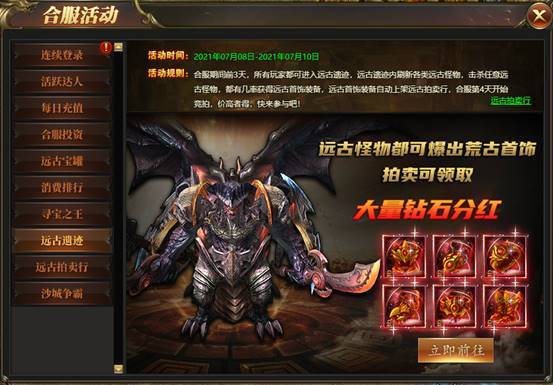 合服期间前3天,所有玩家都可进入远古遗迹,远古遗迹内刷新各类远古怪物,击杀任意远古怪物,都有几率获得远古首饰装备,远古首饰装备自动上架远古拍卖行,合服第4天开始竞拍,价高者得,快来参与吧!