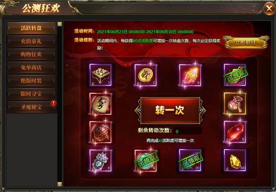 活动期间内,每获得60点活跃度可增加一次转盘次数,每次必定获得奖励!