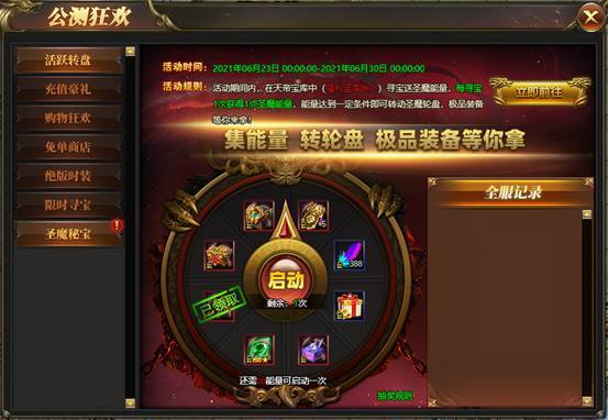 活动期间内,在天帝宝库中(福利宝库除外)寻宝送圣魔能量,每寻宝1次获得1点圣魔能量,能量达到一定条件即可转动圣魔轮盘,极品装备等你来拿!