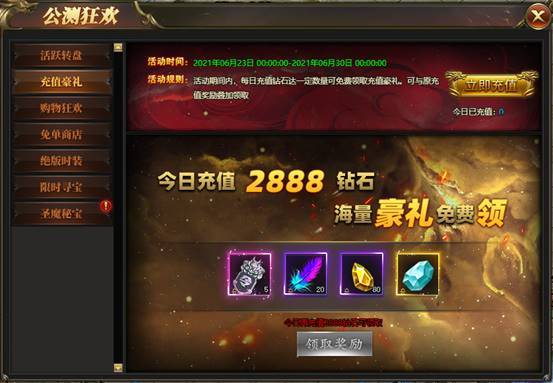 活动期间内,每日充值钻石达一定数量可免费领取充值豪礼。可与原充值奖励叠加领取!