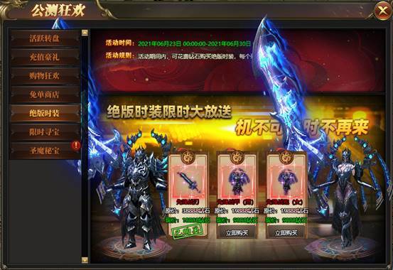 活动期间内,可花费钻石购买绝版时装,每个玩家限购一次!