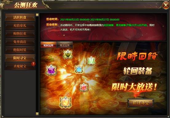 活动期间内,天帝宝库中有概率抽取强力轮回装备、青龙装备(开服20天以后开启),限时大放送,机不可失时不再来!